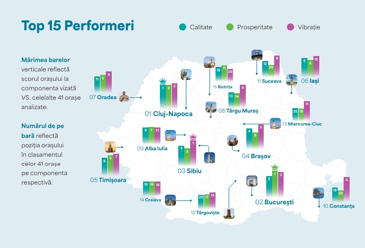 Târgu Mureș a obținut un punctaj de 47.7, excelând la 51 de indicatori care reflectă aspecte esențiale ale performanței urbane, grupați în trei categorii principale: Calitate, prosperitate și vibrație.