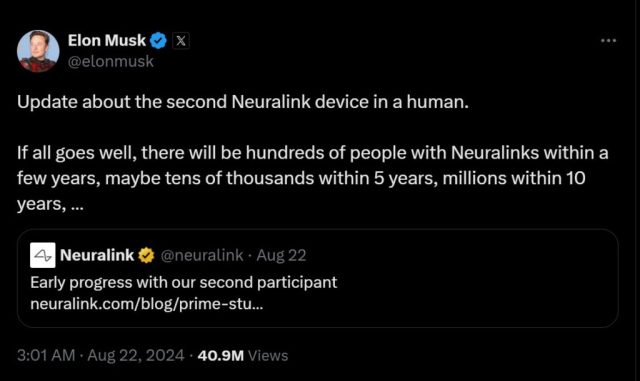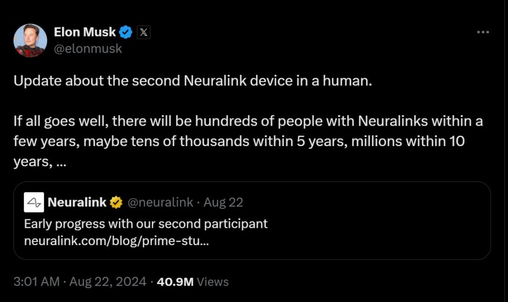 În luna februarie a acestui an, Musk menționa că primul pacient care a primit un implant Neuralink și-a revenit bine după operație și a învățat să controleze un cursor de mouse cu ajutorul minții. Totuși, câteva luni mai târziu, compania a anunțat că unele fire din implant s-au desprins de creierul pacientului în primele săptămâni post-operatorii, semnalând că tehnologia încă se află în faze de testare și perfecționare.