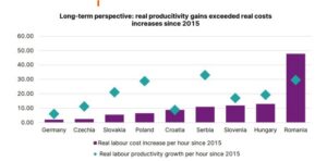 În privința costurilor salariale, România a înregistrat o dublare a acestora față de 2015, depășind ritmul de creștere al productivității. Chiar și așa, acestea reprezintă doar aproximativ 35% din media UE, fiind devansate doar de Bulgaria. În același timp, nivelul scăzut de acumulare de capital și subdezvoltarea infrastructurii economice frânează potențialul de creștere sustenabilă.