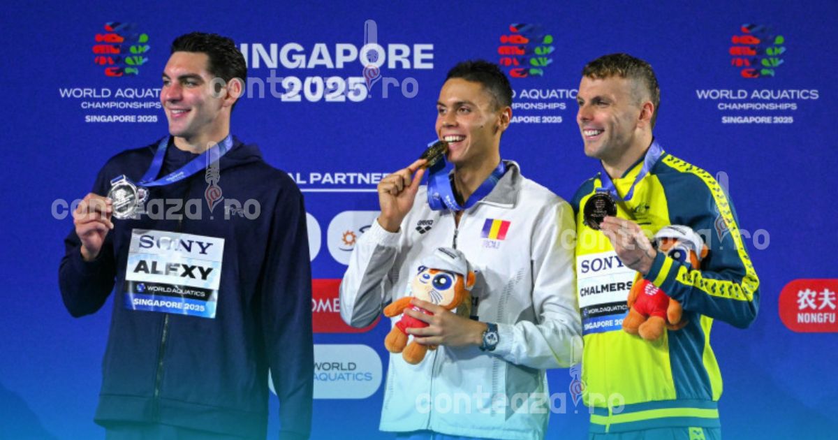 SPORT. David Popovici (20 de ani) continuă să scrie istorie în natația mondială. După victoria impresionantă la proba de 200 de metri liber, sportivul român a dominat și cursa de 100 de metri liber, cucerind aurul mondial la Campionatele de la Singapore.