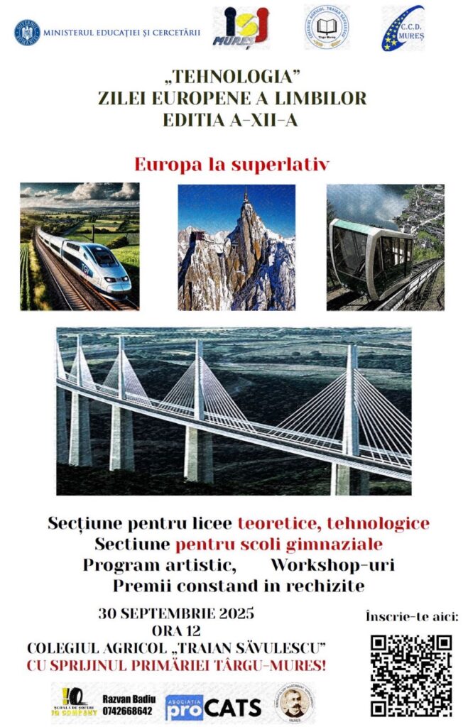 EVENIMENT. Colegiul Agricol „Traian Săvulescu” din Târgu Mureș, cu sprijinul Inspectoratului Școlar Județean Mureș, al Casei Corpului Didactic Mureș și al Primăriei municipiului Târgu Mureș, organizează marți, 30 septembrie 2025, de la ora 12:00, a XII-a ediție a concursului „Tehnologia” – eveniment dedicat Zilei Europene a Limbilor. Competiția va avea loc în Sala Festivă a colegiului.