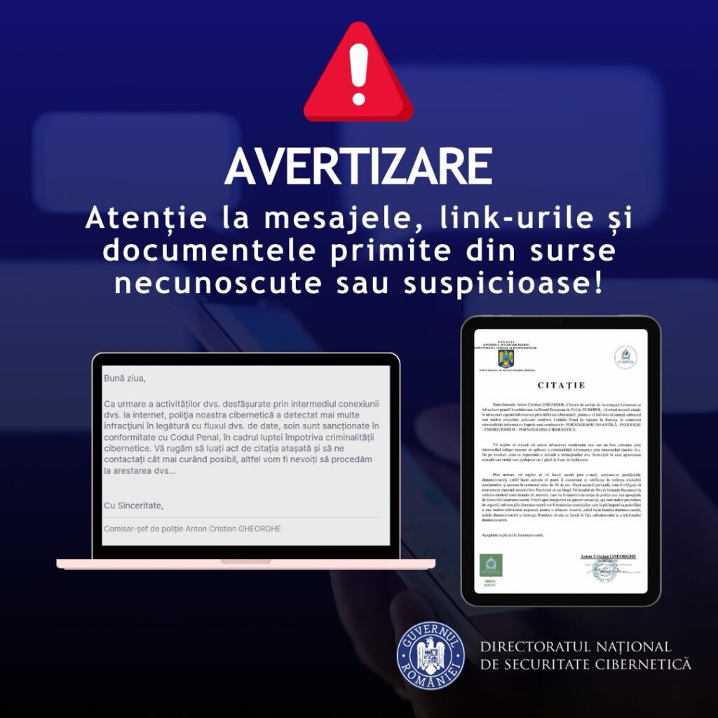 ATENȚIE. Directoratul Național de Securitate Cibernetică (DNSC) avertizează că grupări de infractori cibernetici folosesc în continuare identitatea vizuală și numele unor autorități precum Interpol, Europol, Poliția Română, ANAF sau chiar DNSC, pentru a derula campanii de fraudă online.