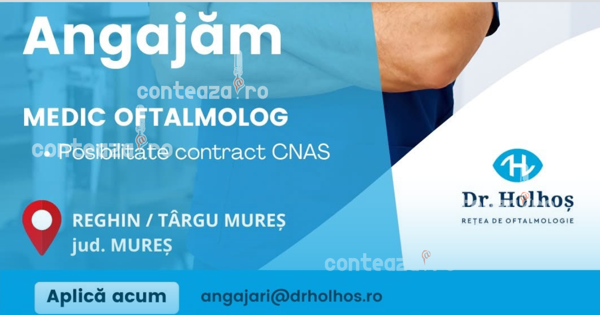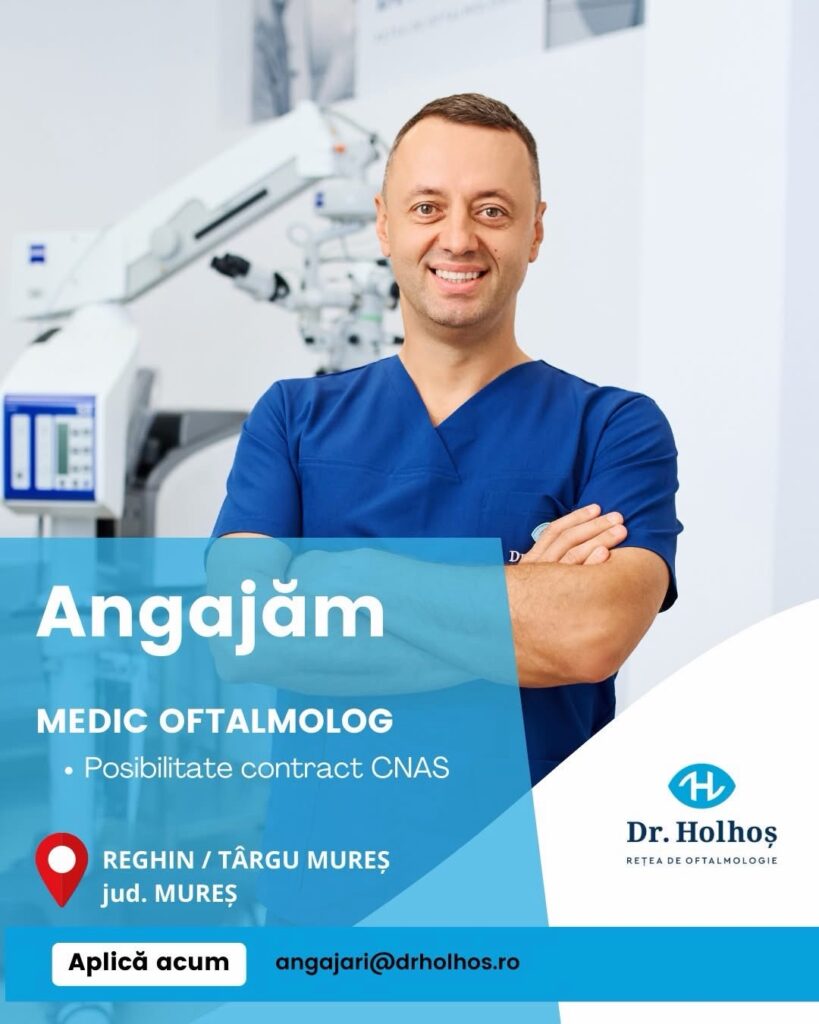 SĂNĂTATE. Rețeaua de clinici Dr. Holhoș anunță extinderea echipei și deschide noi poziții pentru medici oftalmologi în Reghin și Târgu Mureș, în județul Mureș. Posturile sunt full time, iar candidații pot beneficia de posibilitatea încheierii unui contract cu CNAS.