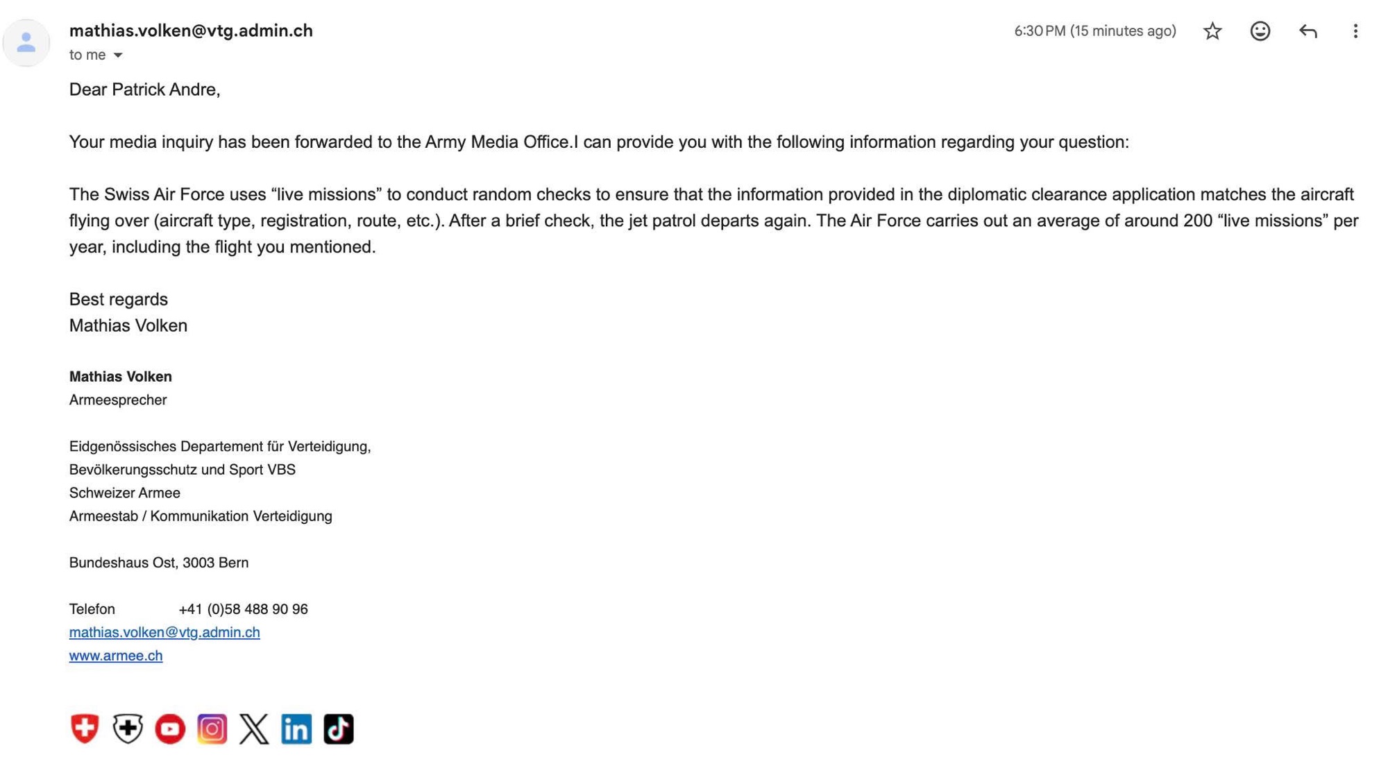 Doar că realitatea oficială transmisă ulterior de Armata Elvețiană a fost mult mai puțin spectaculoasă. Potrivit explicațiilor oferite jurnalistului Patrick André de Hillerin de către purtătorul de cuvânt Mathias Volken, intervenția avioanelor F/A-18 a făcut parte dintr o misiune standard de poliție aeriană, o „live mission”, prin care sunt verificate aeronavele străine care tranzitează spațiul aerian elvețian pe baza unor aprobări diplomatice. Astfel de misiuni au loc de aproximativ 200 de ori pe an și nu au niciun caracter ceremonial.